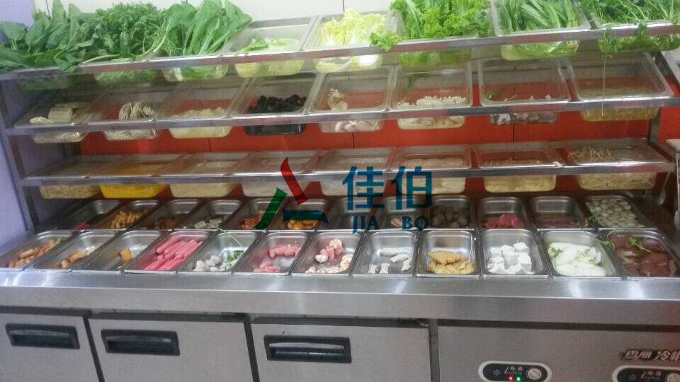 1、麻辣烫点菜柜采用不锈钢板制造,精工打造,外观大方得体,质量上乘,使用放心。