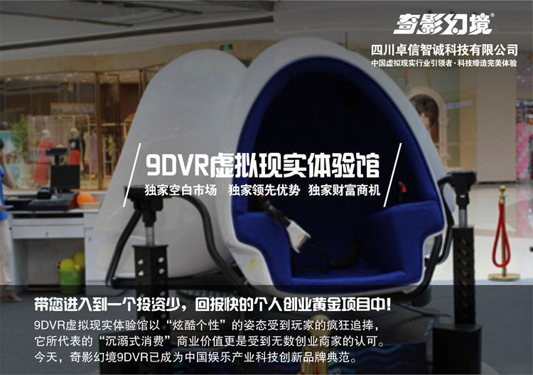 奇影幻境9d电影体验馆作为全球首个虚拟现实娱乐商业化项目,奇影幻境独创性实现了虚拟现实技术的商业落地,解决了虚拟现实同时面向消费者和投资者的商业化难题。零同类产品,零竞争对手,人无我有的独门生意让投资者更赚更轻松!