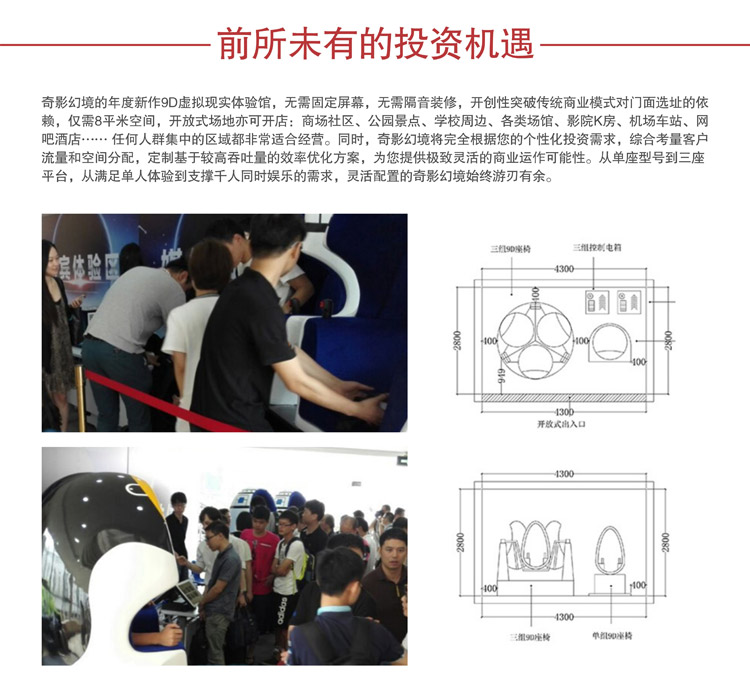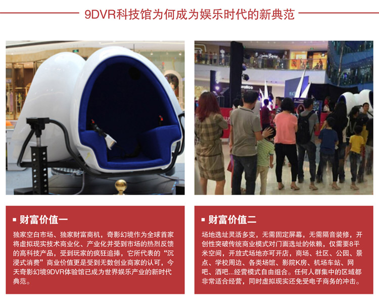 无需固定屏幕,无需隔音装修,开创性突破传统商业模式对门面选址的依赖,最小仅需8平米空间,开放式场地亦可开店:极致灵活的9DVR遍布商场社区、公园景点、学校周边、影院K房、机场车站、网吧酒吧……已成为人们即时娱乐最佳去处。