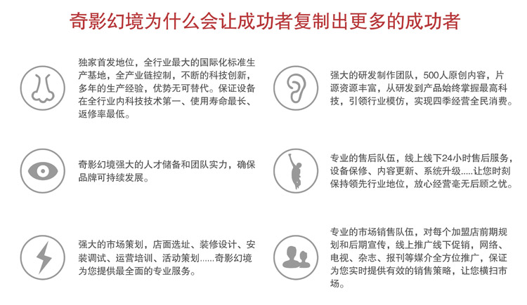 如何延续VR新鲜感,让生意持续火爆?奇影幻境为9D项目搭建了资源丰富多样的9DVR娱乐内容平台,影片完全自主研发,并持续升级更新。强大内容壁垒,有效帮助投资者时刻黏住顾客,始终保持领先。