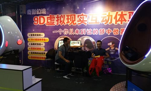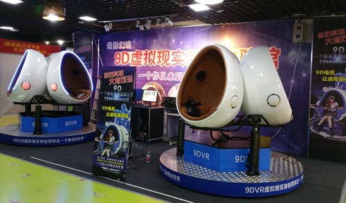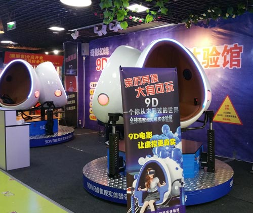 虚拟现实影院:中国首家推出了虚拟互动娱乐商业化项目设备、第一套9D虚拟现实体验馆,独创性地将360°沉浸式尖端体感虚拟现实技术,动感仿真数控机械技术和多元化娱乐体验游戏内容结合一体,打造出一体化的虚拟现实体验馆。其功能并兼了5D影院的动感效果、7D影院的互动效果更是增加了全感官沉浸在虚拟新世界的超震撼真实体验。