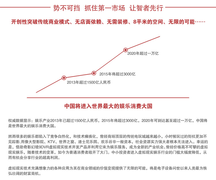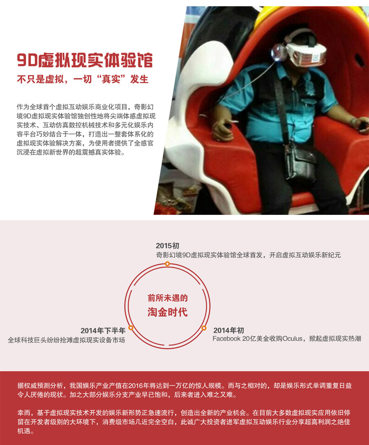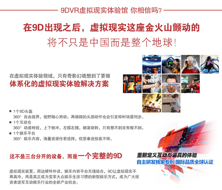 0同类产品!0竞争对手!9D让虚拟现实不再高冷,而是真正成为变革大众娱乐生活习惯的新型娱乐方式,成为广大投资者进军互动娱乐行业的全新产业机会。