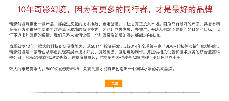 作为全球首个虚拟互动娱乐商业化项目———奇影幻境9D虚拟现实体验馆,独家实现虚拟现实装置、周边硬件外设和娱乐内容平台的全产业链无缝结合,打造出一整套体系化的虚拟现实体验解决方案,为使用者提供超越时间、空间和想象力的超震撼体验。