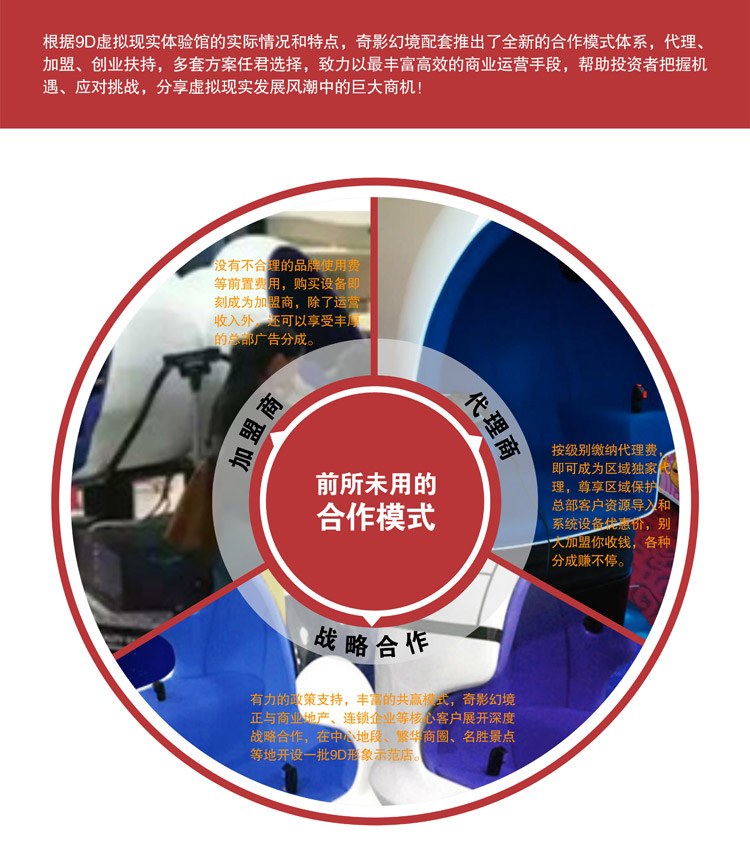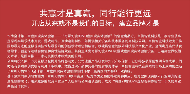 奇影幻境9D VR作为全球首个虚拟现实娱乐化商业项目,消费级市场几近空白,正是抢滩虚拟现实设备市场之绝佳机遇,谁能抢占空白市场,谁就能独揽全球第一桶金。抢摊虚拟现实娱乐市场,就在此时!就在此刻!