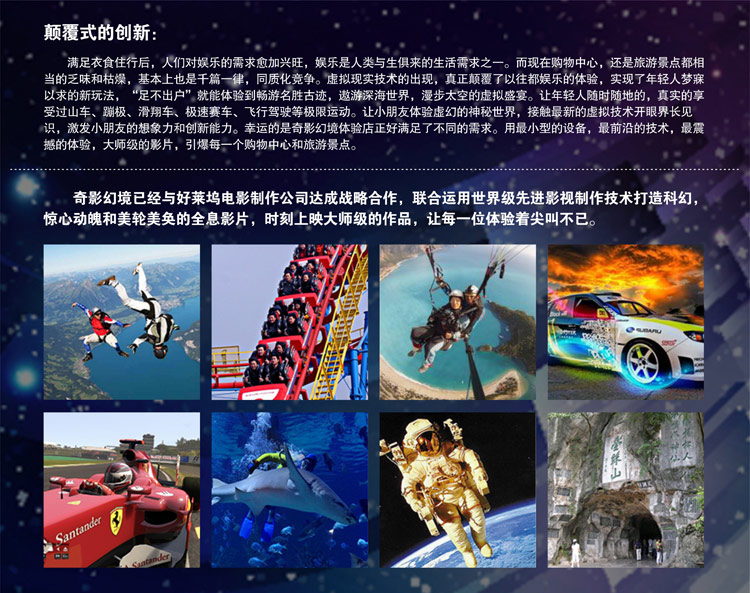 作为全球首个虚拟互动娱乐商业化项目———奇影幻境9D虚拟现实体验馆,独家实现虚拟现实装置、周边硬件外设和娱乐内容平台的全产业链无缝结合,打造出一整套体系化的虚拟现实体验解决方案,为使用者提供超越时间、空间和想象力的超震撼体验。