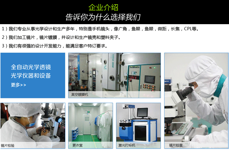 1)我们专业从事光学设计和生产多年,特别是手机镜头,像广角,鱼眼,鱼眼,微距,长焦,CPL等。