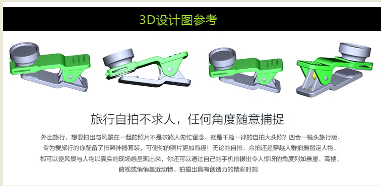 2)通用万能夹,适用于智能手机和平板电脑,镜头安装简单,一步卡扣到位,带有加厚防滑衬垫,防止划花损伤手机。