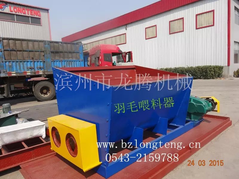 羽毛喂料器 用途:把湿羽毛送进羽毛挤水内,进行脱水。 特点:1、双螺杆结构,喂料速度可调; 2、结构合理,运行稳定。