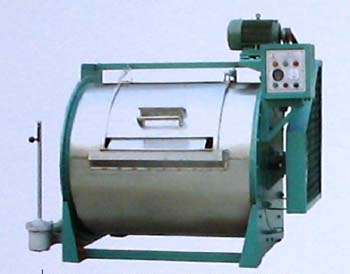 本机采用卧式滚筒结构,与洗涤液接触部分均采用不锈钢。推开外壳移门,打开滚筒内门,将衣物放入外壁多孔的滚筒,关闭各门,加水于外壳内使滚筒浸没于水中。启动电机带动滚筒倒顺运转,使衣物上下翻动,同时加入洗涤剂通入蒸气进行洗涤。洗涤完毕,排除污水,再加入清水反复漂洗直至达到要求。本机滚筒倒顺运转采用正反转自动控制器控制,洗涤和漂洗时间用定时器任意设定。