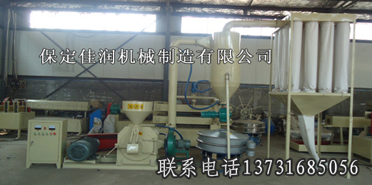 河北保定佳润机械有限公司专业生产各种型号的磨粉机,塑料磨粉机,不锈钢磨粉机.产品质量好,销售量广,价格低,多年来我厂以质优价廉广受客户赞誉,欢迎前来选购磨粉机,塑料磨粉机,不锈钢磨粉机。塑料磨粉机是先让物料由进料斗进入机体,由主轴刀盘的高速旋转与定刀盘高速旋转使进入的物料高速运动与磨板,刀片发生强烈碰撞,切割而成粉状理学。再由出料风机将粉料送出,经旋风分离器,粉料由关风机送出,气体进入集尘装,通过除尘袋排出。 塑料磨粉用途 : 1.塑料磨粉机适用范围广,可对商标纸、树脂、标签纸、塑钢型材、钢窗料、塑料管材料、扣板、聚氯乙烯PVC、聚乙烯PE(HDPE/LLDPE/LDPE)、聚苯乙烯PS、发泡PE、发泡pvc、EPS保温板、聚苯硫醚PPS、ABS、PPR等塑料制品进行研磨. 2.塑料磨粉机安装维护方便,打开门盖即可清理. 3.磨粉机由主轴刀盘的高速旋转与定刀盘高速旋转使进入的物料高速运动与磨盘发生强烈碰撞,切割而成粉状。 4.磨粉机使用方便.磨粉粗细可调.通过主轴螺母调整垫圈即可 5.配有风送出料装置,以保证物料冷却均匀,冷却速度快等特点。