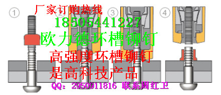 实现环槽铆钉最佳铆接的关键设计是环槽铆钉、铆套的材质及其结构设计, 当铆套受挤压变形达到最佳状态时,环槽铆钉必须在环槽处被拉断。如果提前拉断,铆套的变形小,不能达到晟大的预紧。如果置后拉断,铆套变形严重,铆套强度和接触面积减小,二者均不能达到最佳的联接 经过长期的力学测试和实验对比,我们确定了最佳的配套材质和相应环槽尺寸。