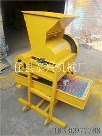 本机采用纹杆、栅条、凹板、风机、比重分选及二次提升机等几部分组成,结构简单紧凑、操作简便、性能稳定、安全可靠。 工作原理:花生果由人工喂料,先落到粗文栅里,由于文板转动与固定栅条凹板间的搓力,将花生壳剥离分离后的花生仁与壳同时经过栅网落下,再通过风道过由风力将大部分花生壳吹击机外,而花生仁和一部分尚未剥离的花生小果一起落入比重分选筛,经过重筛选后,花生仁由分离筛面上行,通过料口流入麻袋,而尚未剥离的花生(小果),则由筛面下行,经过出料道口流入提升机,再由提升机送入细纹栅进行二次剥壳,再经过比重分行筛分选,即可达到全部剥离。