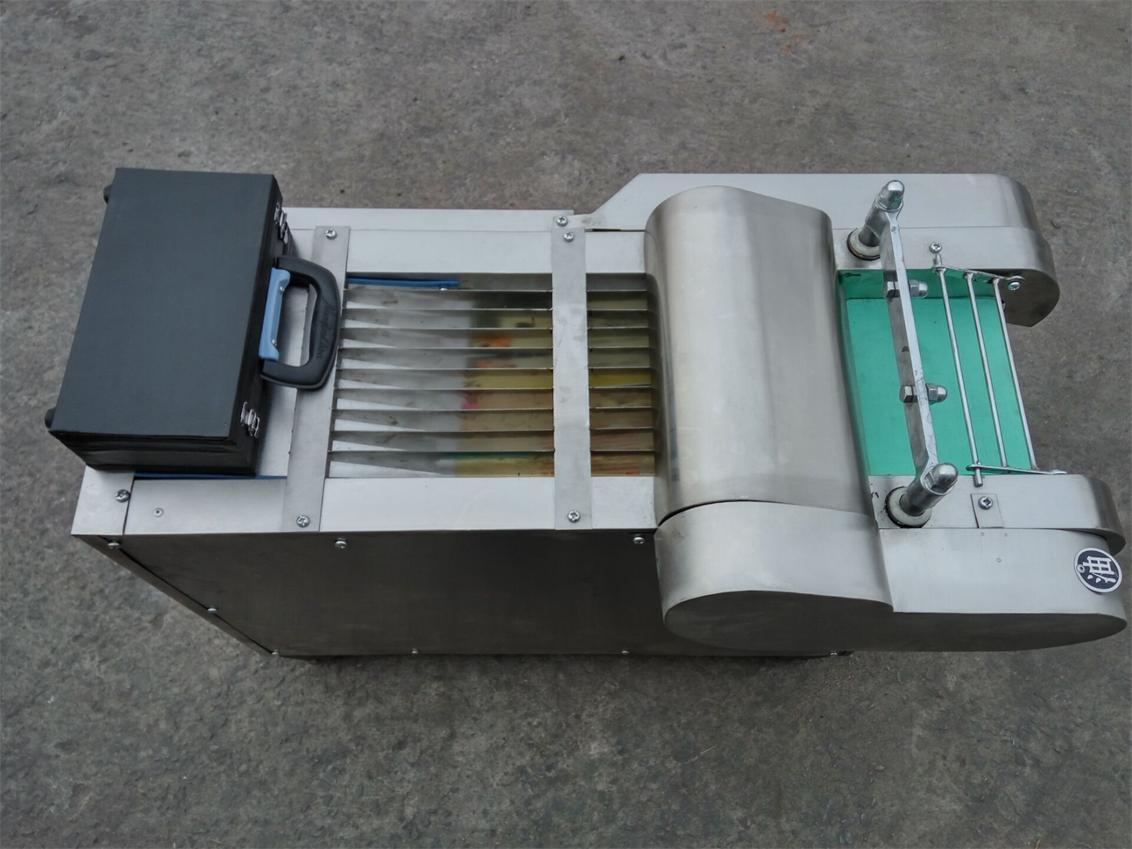 2.2其他切菜机安装竖刀:先转动可调偏心轮,使刀架行至下死点后,再使刀架向上抬起1/2毫米,使竖刀与输送带接触后,紧固螺母把竖刀紧固在刀架上。说明:高架抬起高度可根据所切蔬菜自行掌握。如果高架抬起高度小,蔬菜有可能连刀,如果高架抬起高度过大,有可能切坏输送带。