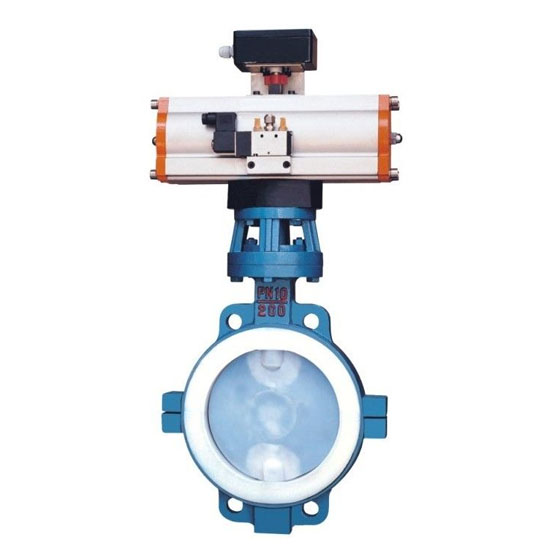 气动衬氟蝶阀D671F4-10C采用带有球形密封表面的衬氟塑料包衬蝶板,配以阀座基部的硅橡胶衬垫调节阀门的密封性能;该阀门操作轻便,严密的密封性能,超长的使用寿命;可作快速切断或调节流量之用。适用于要求可靠密封和良好调节特性的场合。阀体采用分体式,阀轴现端的密封由蝶板与阀座之间的旋转基面加氟橡胶来控制,从而达到产品结构紧凑、外形美观、工艺合理、性能可靠。保证阀轴不与腔内流体介质接触,更换阀轴时非常方便,阀门不需要拆离离管道即可完成。产品广泛适用于各种不同类型工业管道中液体和气体(包括蒸气)的输送,特别是具有严惩腐蚀性介质的使用场合如、氢氟酸、磷、酸、氯气、强碱,王水等具有强腐蚀的介质。