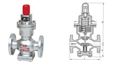 1,Y44H波纹管减压阀阀前进口介质压力从阀瓣和阀体密封圈开启间隙进入体腔使介质压力流满波纹管的组合箱,波纹管和弹簧因受介质压力的挤压而压缩,阀瓣随着阀杆位移,阀瓣产生对阀体密封圈的关闭,将阀前介质截止,不作阀后介质压力的补充。当阀后的介质压力降低,波纹管因受调节弹簧的径项力,使波纹管叠纹变形,阀杆将阀瓣顶开。使介质通过阀体密封圈补充阀后压力的降低。