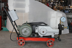 试压泵在开始使用之前,应首先进行检查调整各处的联接部件是否有松脱现象。进出水管管路是否畅通,水箱内的水是否清洁,严禁使用含有纤维泥沙杂物的污水,防止影响泵的使用性能。检查调整完毕之后,将被试压容器与工作接管接通。关闭放水阀针,打开控制阀针,然后操作手柄上下浮动,用力要均匀避免冲击,使柱塞做往复运动,把水箱内的清水经吸水管吸入低压缸,进入高压缸和控制器,由工作接管流入被试压容器,其压力值可以从压力表上读出。试压时压力应在压力表的最大指示值的2/3以内工作。最大工作压力不得超过本型号试压泵所规定的额定排出压力值。