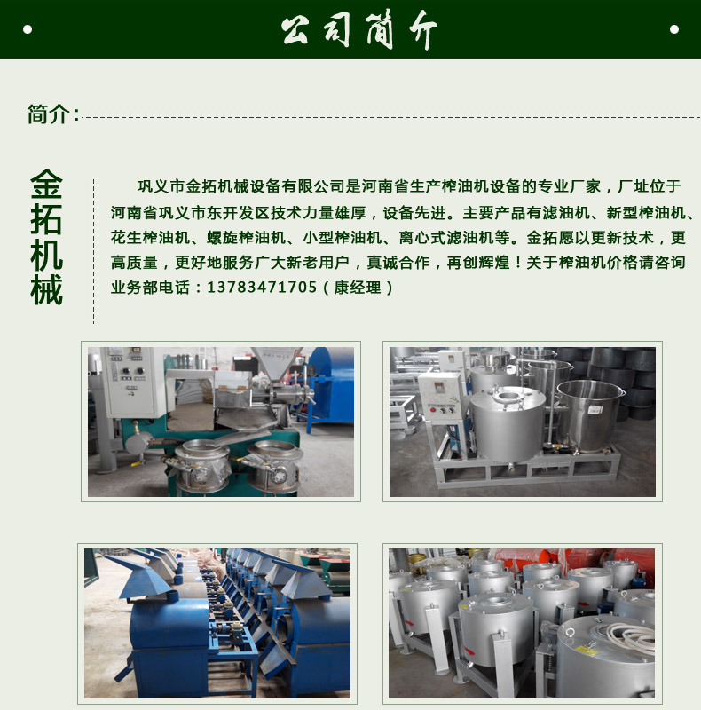 花生榨油机设备首选郑州金拓机械 十年老字号 厂家直销 诚信经营花生榨油机的选择是很多客户的首要问题,因为厂家和机器的质量是息息相关的,不过在市场上也充斥这很多代加工的企业,这些企业把榨油机设备的价格压得过于低,客户朋友们,你们可想而知,他们做榨油机的材料用的是上等的还是中等的,下等的呢?一分价钱一分货,千百年来,一直不变的真理。开办榨油坊,该如何选配榨油机设备?专业生产多功能螺旋榨油机,冷热两用榨油机,花生榨油机和菜籽榨油机等配套设备,金拓机械花生榨油机以出油率高、价格合理深受广大农民朋友们的喜欢。