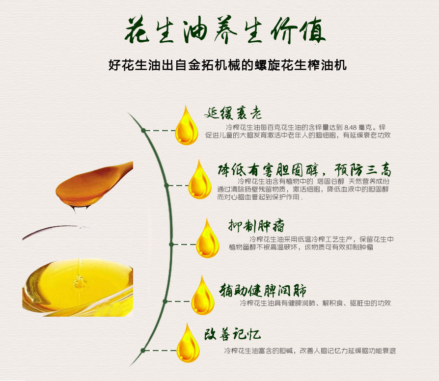 金拓新型螺旋榨油机生产的榨油机是为了榨出的各类食用油保留了油料中各种营养物质和原汁原味,安全卫生、口感纯正、香味浓郁,生产的榨油机产品成为榨油机行业先锋。