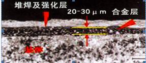 电火花堆焊修复机的原理是运用电火花沉积工艺,将电容存储的高能量电能,在金属电极与母材间瞬间高频释放,通过电极材料与母材之间的空气电离,形成通道,使母材表面产生瞬间高温、高压微区;同时离子态的电极材料在微电场作用下熔渗进母材基体,形成冶金结合。由于该工艺是瞬间的高温--冷却过程,不仅使金属表面因淬火形成马氏体,而且在狭窄的沉积过度区形成超细奥氏体组织。电火花沉积工艺不是焊接,也不是喷涂或元素渗入工艺,简单的讲,是介于其间的工艺。金相显微组织: