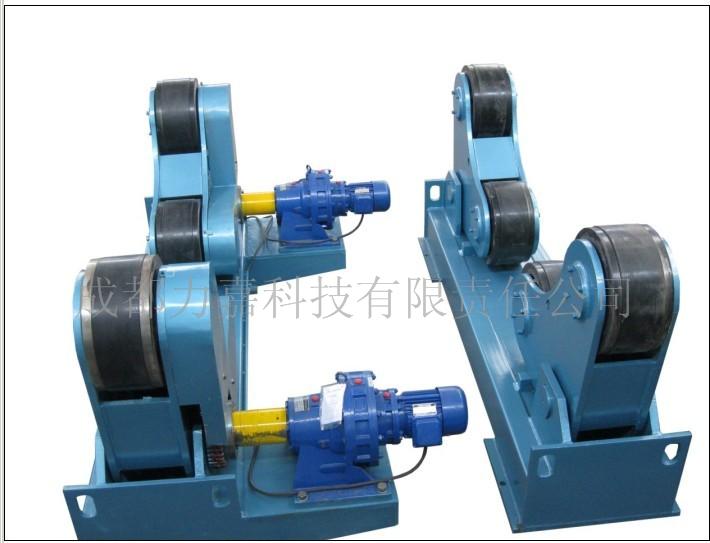 自调滚轮架→主要由:机座、主动滚轮组、从动滚轮组、驱动机构、控制系统组成;滚轮架是利用滚轮与工件之间的摩擦力带动工件旋转的变位设备,可根据工件直径大小不同的需求,移动滚轮组,调节滚轮中心距满足工件尺寸变化。该设备可用于管道、容器、锅炉、油罐等重型圆筒形工件的装配与焊接,与我公司操作机、埋弧焊机配套,可以实现工件的内、外纵缝或内外环缝焊接;若对主、从动滚轮组的高度作适当的调整后也可进行锥体、分段不等径回转体的装配与焊接。对于一些非圆形焊件,若将其装卡在特制的环形卡箍内,也可在该滚轮架上进行焊装作业。
