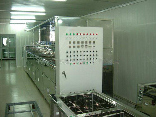 三级超声波洗剂洗→二级超声波市水洗→喷淋洗→三级超声波纯水洗→纯水慢拉脱水→二级热风干燥