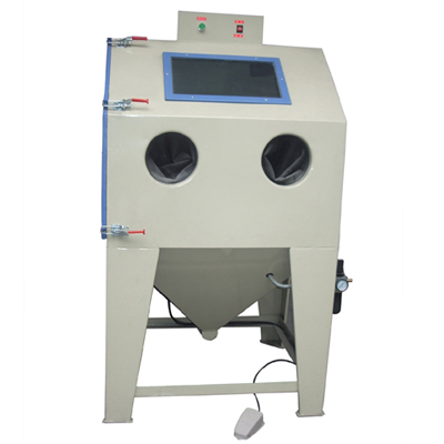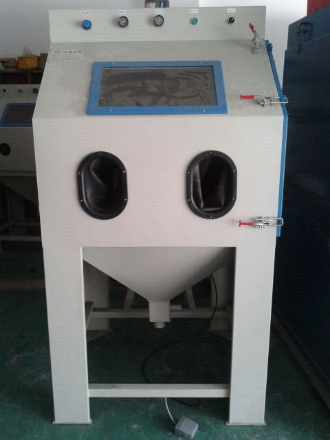 ·本机为普压箱式干喷砂机,采用手动操作控制方式,适合于小批量生产(按照以上规格产品计算,工时10小时,材质为铁件,表面处理要求为除锈,清理等级Sa2.5级以上,六个外表面全部处理,产量大概在300~500件左右);产量的变化依据锈层的深浅、工人操作的熟练性、上下工件的速度与所选用的砂料的好差。