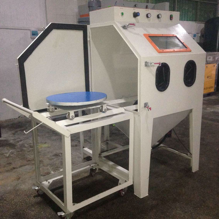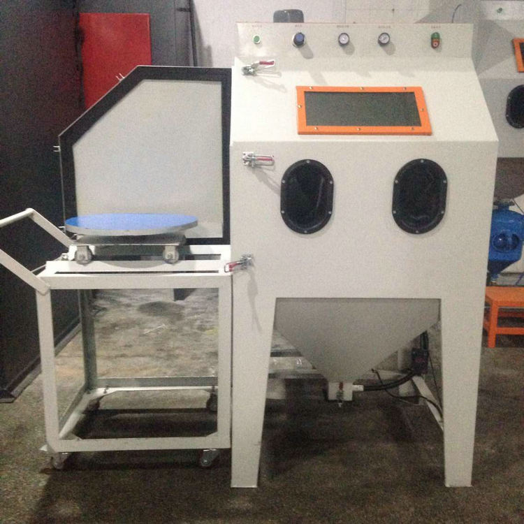 百诚牌推车转盘手动喷砂机也称模具喷砂机它是一款非标类喷砂设备,主要是以手动喷砂机为主体在此基础上根据客户的需求加装推车,转盘,滚轴,分离器,温控器以及各类装制,这款转盘手动喷砂机主要适用于较大型重量的工件比如:瓷砖喷花纹,石材刻字,五金除锈,陶瓷制品、玻璃制品、塑胶制品光饰、雾化作用、去毛边、去毛刺,增强喷涂附着力等等.