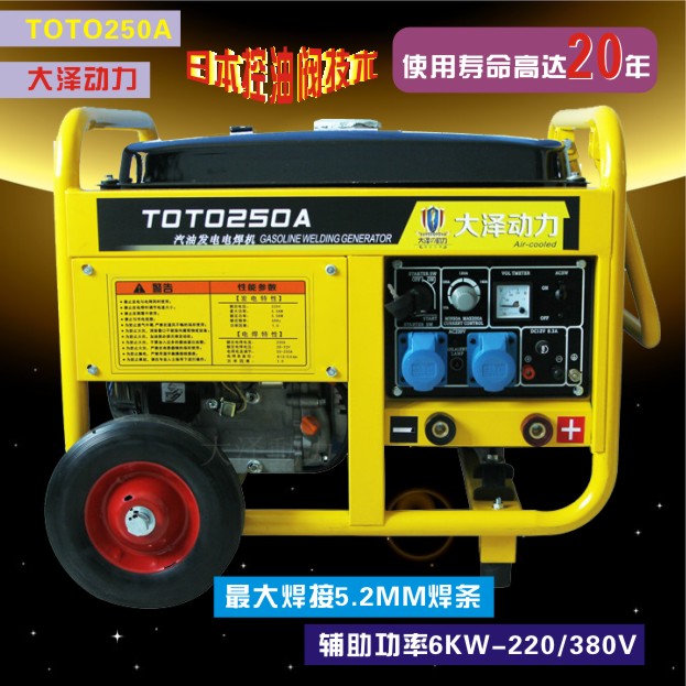 TOTO250A-250A汽油发电焊机,本公司发电电焊机具有移动式特点,可满足用户长短期的各种用电需求。面向建筑工地、公路建设、地铁施工、商场备用等场合使用,而且还是多家企事业单位临时供电的最佳伙伴。产品特性:可焊5.0焊条发电电焊机大泽发电电焊机引进日本最先进技术将发电机和电焊机完美结合,具有动力启动快捷、运转平稳、震动小、油耗省、体积小、结构紧凑、点火稳定可靠等优点,大大提高您的工作效率,户外施工的理想伴侣