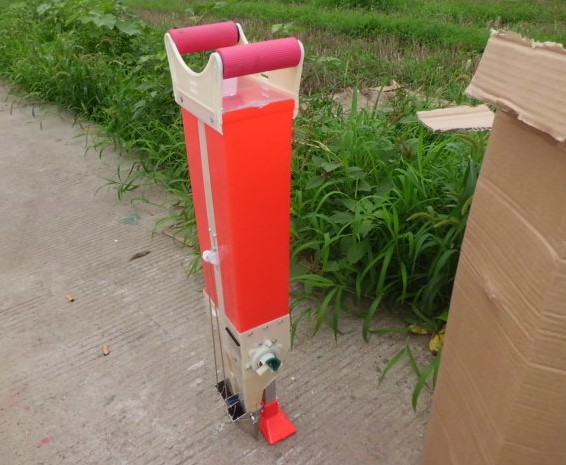 (2)双手握住手柄,对准垄上标尺点出的印迹,快速插入土中,缓势拔出,往扎完的埯上踩一脚或扎完后镇压一遍效果既快又好。