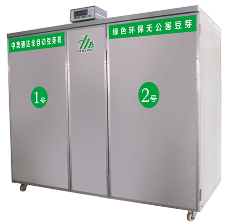 中美通达600型豆芽机 设备设计有“微电脑控制器”、“多屏数显”、可实现智能化控制水箱温度、生长室温度,淋水时间、淋水间隔时间、泡豆时间、生长时间,超温强制淋水时间,缺水自动报警保护功能;预设参数掉电记忆功能,意外漏电保护功能,安全可靠。 不锈钢架结构: 采用不锈钢、铝合金框架,箱体为保温、防水、防锈的复合彩钢板,设计合理外表美观;全新升级改进的水箱为不锈钢或PVC塑板制作而成,使用寿命长并具有节水节能等优点。 电盘(电脑)控制: 整机可实现全自动化,能提供豆芽生长的适宜空间,无需专人看管、省时省力。 箱 体: 可实现多箱体分体控制、箱体内温度显示、高温报警、高温淋水、箱体自动加温、恒温箱内空气循环等功能。 水 箱: 可实现水箱温度显示、高温报警、水箱自动加水、自动加温、恒温自动淋水、高温强制淋水、淋水间隔时间显示、淋水延时显示、手动淋水等功能。 臭氧消毒机:可针对水箱、箱体及各类豆芽菜进行消毒灭菌处理。臭氧不仅可直接杀灭病毒,还可以通过杀灭病毒所寄生的细菌和微生物,提供