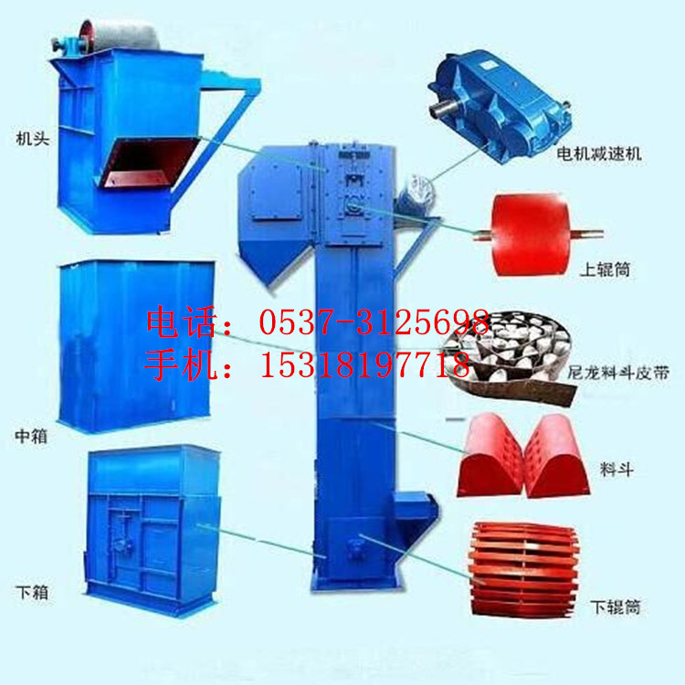 斗式提升机的牵引构件有环链、板链和胶带等几种。环链的结构和制造比较简单,与料斗的连接也很牢固,输送磨琢性大的物料时,链条的磨损较小,但其自重较大。板链结构比较牢固,自重较轻,适用于提升量大的提升机,但铰接接头易被磨损,胶带的结构比较简单,但不适宜输送磨琢性大的物料,普通胶带物料温度不超过60°C,夹钢绳胶带允许物料温度达80°C,耐热胶带允许物料温度达120°C,环链、板链输送物料的温度可达250°C。