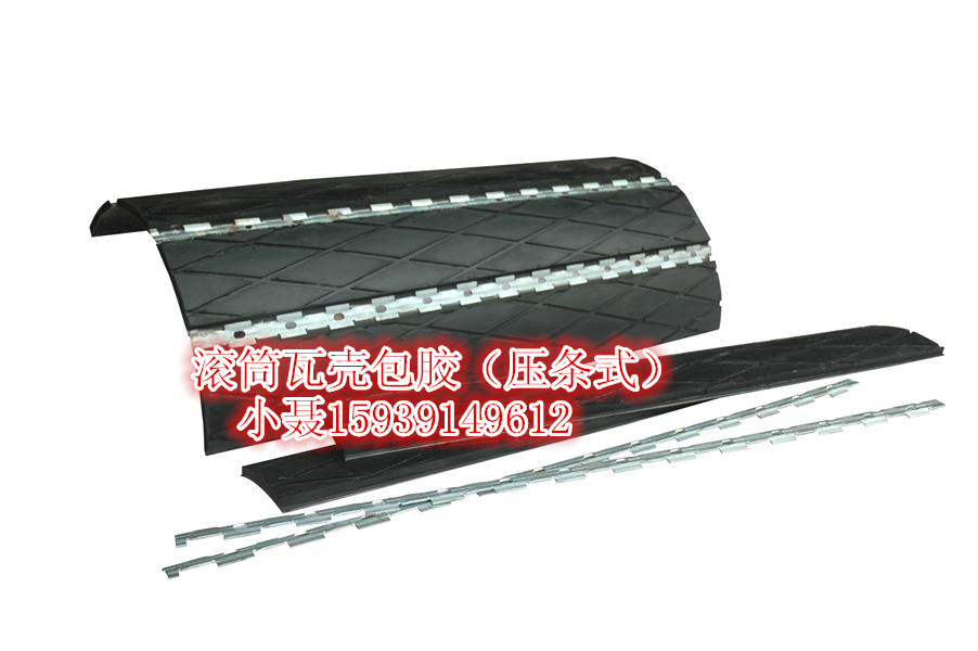 瓦壳式滚筒包胶由瓦壳式胶板、压条组成。压条在安装时焊在滚筒上并压紧瓦壳式胶板。瓦壳式胶板由耐磨胶层和金属层热硫化而成,结合牢固具有很高的耐磨性和柔韧性,抗拉力及抗撕裂性能强。特制的菱形花纹辅助皮带运行,摩擦力和牵引力加倍。