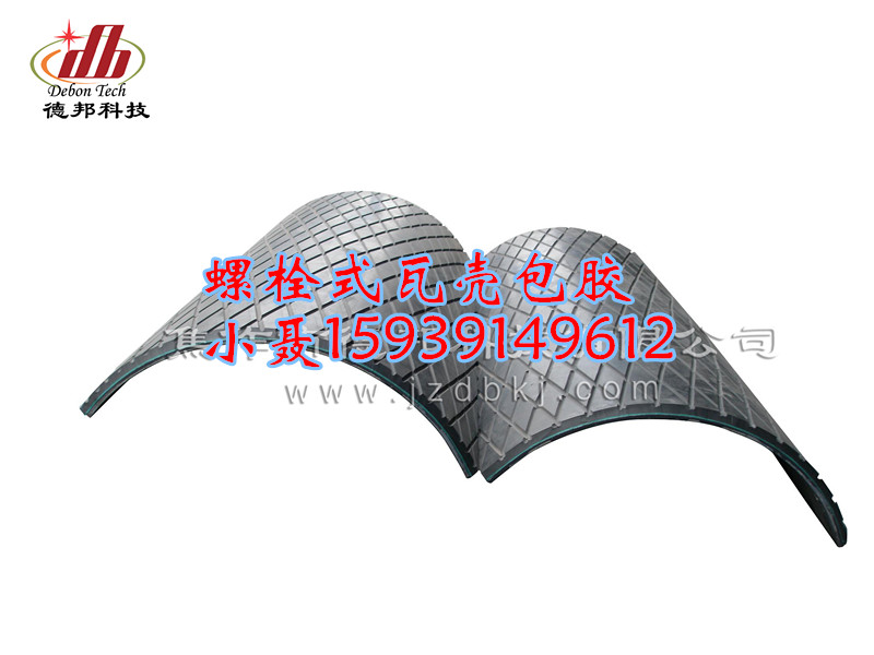 螺栓连接式滚筒瓦壳包胶是瓦壳胶板通过螺栓与滚筒连接。瓦壳胶板由耐磨胶层和金属层热硫化而成,结合牢固具有很高的耐磨性和柔韧性,抗拉力及抗撕裂性能强。特制的菱形花纹辅助皮带运行,摩擦力和牵引力加倍。可现场安装,滚筒不需拆装,方便快捷,适用于尺寸小于Φ1400×1400的滚筒。