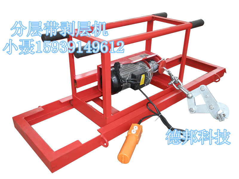分层带剥层机用于多层输送带的剥层,由卷扬机.机械部分和导向系统组成.卷扬机包括电机和减速机,两者装在导向系统中,使用时移动方便,减少输送带的拉力,不易使输送带来回摆动。卷扬机和牵引系统连接在一起工作。电机分为防爆和非防爆,根据使用环境选择。