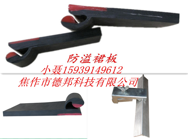 导料槽防溢裙板为双层结构,通过一套快速压紧装置(蝶形螺母式或手柄式)安装在皮带机导料槽的下沿,用于输送带与导料槽直接密封。同类裙板还有:平面全橡胶防溢裙板,T型橡胶裙板,平面聚氨酯防溢裙板。