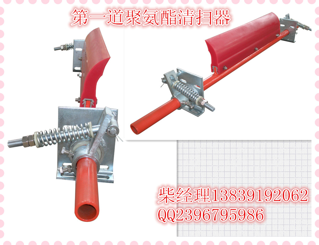 第一道聚氨酯清扫器(普通型)一级皮带机聚氨酯安装在头部滚筒中心线偏下的位置,是带式输送机上现有合金清扫器的更新换代产品。其刮刀选用进口高分子改性材料,耐磨损、防腐蚀、防断裂、耐水解、不损伤胶带,延长胶带使用寿命。本清扫器具有弹簧张力调整器,当刮刀磨损或皮带跳动时刮刀面会自动跟进、补偿、确保刮刀面与皮带紧密接触,从而实现良好的刮除效果。一段港口皮带机清扫器。