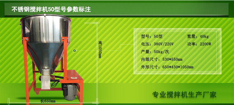 立式搅拌机适用于生产预混料,养猪、兔、羊、鸡、牛、鱼等畜牧养殖业,该卧式混合机引进国外先进技术数据,利用国产化开发设计,是一种新型高效混合设备。由容器、螺旋搅拌叶片和传动部件组成。螺旋叶片一般做成双层,外层螺旋将物料从中央向两侧输送,形成对流混合。该系列混合机能将食盐、饲料、粮食等粉状或颗粒状物料进行均匀混合。具有速度快、混合质量好、卸料时间短、残留量少等特点,是食盐行业的首选机型。该卧式混合机混合速度快、混合均匀度高。