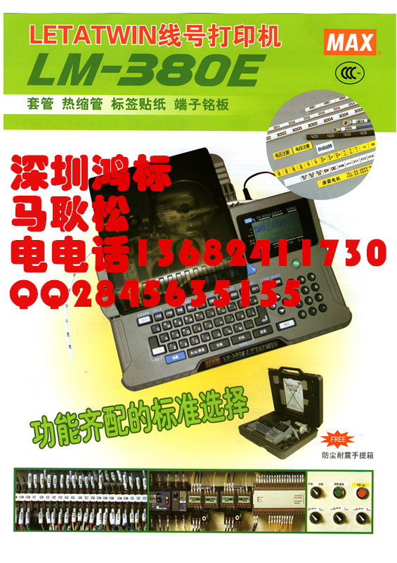 MAX线号机LM-390A-高速电脑线号机品牌马耿松13682411730 电话0755-83986072 QQ2845635155 or 2.0 protocol), RS-232C, 10/100 BASE-TX Wired Ethernet。可以利用数据库链接功能实现大批量标签打印,可以便捷地制作条形码标签等;也可以利用模板功能进行各种访客标签、货架标签、警示标签等特殊标签地制作;标配网络功能,可接受多个用户指令打印标签;在局域网内的用户,可以通过网络,把数据传输到标签打印机上来实现数据共享;一个工作小组只需拥有一台标签打印机就可以完成多项工作任务,工作效率得到了大大提高。MAX线号机LM-390A-高速电脑线号机品牌