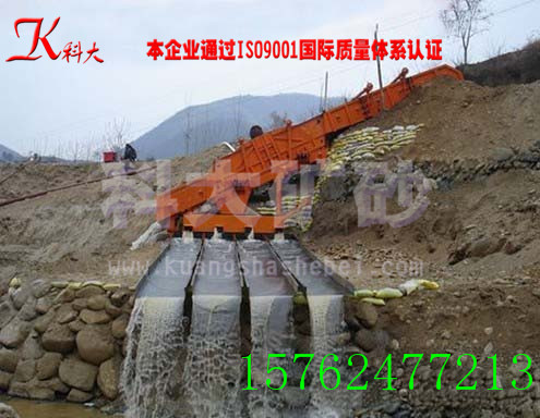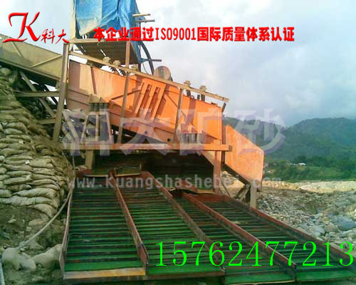本机械装载于底盘上,可用装载机短距离拖动,靠近工作面,减少由于远离工作面造成的油料浪费。旱地淘金设备工作流程:由装载机为料斗上料—经传送带传料之滚动筛—筛分后粗料排掉--细料进入旋转澄金毯选出重矿物—重矿物及入选金机选出毛金。