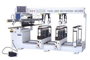 台湾钻排上海地区销售江苏排钻|木工三排钻|上海多排钻|木多排多轴木工钻床,包括床身、支架、水平钻排、横梁、定位压料装置、垂直钻排、压料装置、工作台附架,垂直钻排沿固定在床身上的线性导轨做直线运动,水平钻排设置在床头箱上;垂直钻排的结构为,工作台设在工作台支架上的凹槽中,螺杆上端与工作台支架螺纹连接并与工作台的下端相接触;工作台支架设在垂直拖板上,在拖板的两边设有左右丝杆支撑座,在左右丝杆支撑座之间设有丝杆,滑块与丝杆螺纹连接,滑块沿导轨滑动,滑块上设有电机,电机的上端设有钻排连接板,钻排用螺钉固紧在钻排连接板上的螺孔中;拖板的下部设有定位升降气缸。本实用新型的突出效果是:它加工精度高,水平和垂直钻孔座既可同时作业,也可单独作业,垂直钻孔可作90度调整。