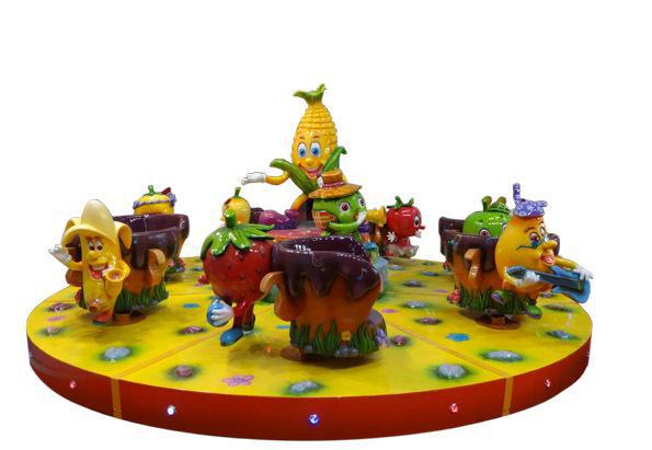 水果转盘,也叫水果派对,水果转杯,是一款新造型转转杯类游乐项目。该设备是巨龙公司在咖啡杯的基础上的大胆尝试,整个设备采用田园色调,大盘中间是个大型的玉米造型,座舱采用各种各样的卡通水果造型做点缀,有芒果、苹果、香蕉、草莓等,个个形态逼真、光彩夺目。当游客坐在各色的水果杯子中感受那份温馨,听着动听的音乐享受着转动带来的欢乐。犹如在秋天的田野里自由飞翔,享受着丰收的喜悦。也可以把握自己的方向,随着大盘公转,小盘在大盘中反转,自己在杯子中任意旋转,感受着旋转带来的乐趣。