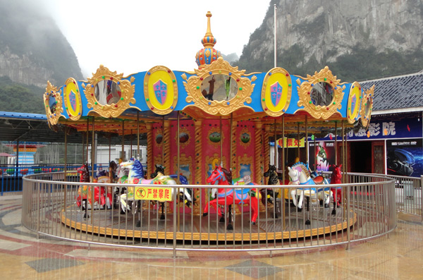 转马启动后,形态各异的转马随之上下起伏,使游乐者产生纵马扬鞭、驰骋疆场的感觉。