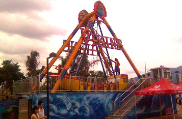 海盗船是一种全新设计的观览车类游艺机,是一种绕水平轴往复摆动的游乐项目,该种游艺机因造型图同而名称各异,“海盗船”因为其外形仿古代海盗船而得名。海盗船造型为美洲印第安部落风格,总高度15米,最高运行速度32km/h,最大摆角60度,海盗船启动后从缓慢摆动慢慢的急速摆动,乘客乘坐于海盗船之上,随着由缓至急的往复摆动,犹如莅临惊涛骇浪的大海之中,时而冲上浪峰,时而跌入谷底,惊险刺激,挑战你的心理承受能力的极限。
