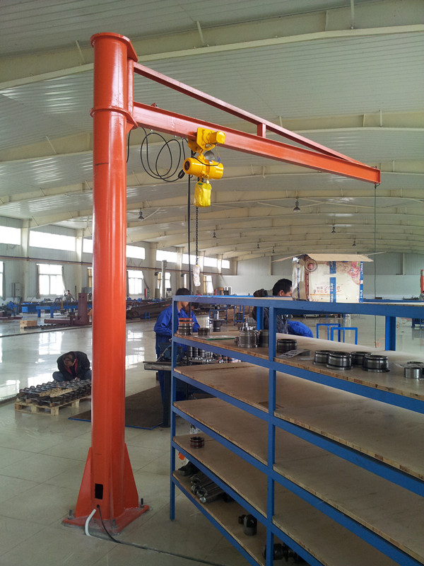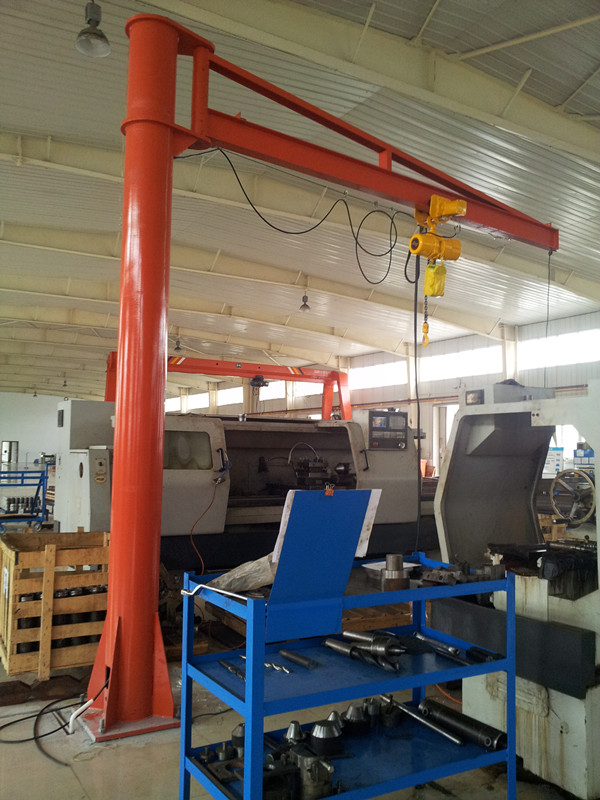 BZD型电动全回转悬臂起重机是与CD1型MD1型电动葫芦配套使用的一种起重机,本起重机由立柱,回转臂回转驱动装置及电动葫芦组成,立柱下端通过地脚螺栓固定在混凝土基础上,由摆线针轮减速装置来驱动悬臂回转,电动葫芦在悬臂工字钢上作左右直线运行,并起吊重物。 本起重机结构简单,占地空间少,作业范围大,操作方便,转动灵活,适用于码头,仓库及车间等固定场所,起重机设有安全保护装置和极限保护装置,安全可行,是理想的起重机械。