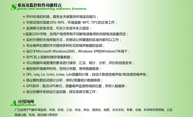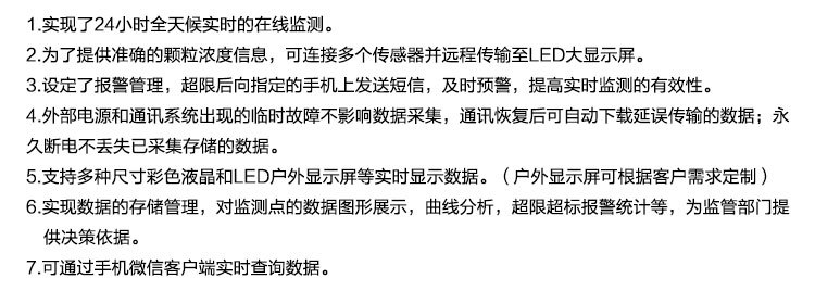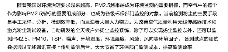扬尘噪音监测仪,随着我过对环境治理要求越来越高,PM2.5越来越成为环境监测的重要指标,而空气中的扬尘作为影响PM2.5指标分的重要组成部分;也成为各级环境部门监控的对象。当前监测粉尘的主要手段是手工采样、分析,监测效率低,而且浪费大量人力物力。为改善空气质量利用无线传感技术和激光粉尘测试设备,自主研发的全天候户外扬尘监控系统,处了可以实现扬尘监控以外,还可以检测PM2.5、PM10、TSP、噪音、环境湿度,风度,风向等环境因子,个测试点的测试通过无线通讯直接上传到检测后台,大大节省了环保部门检测成本,提高检测效率。