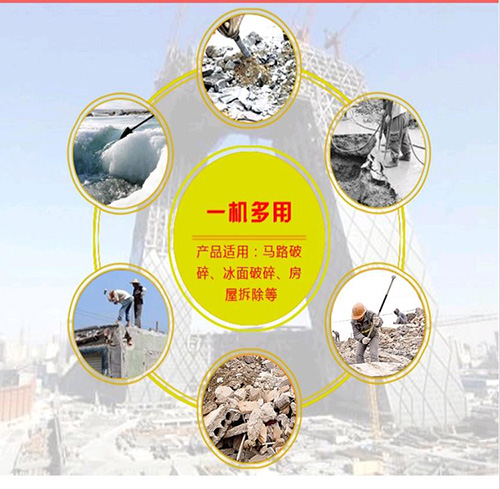 可广泛适用于(1)在公路建筑和土木工程中的破碎和拆除工作;(2)在铁路工作中,捣振铁轨下方的碎石;(3)通过更换不同的机具,该机器可进行各种破碎,铲凿,捣实等工作。作业时删除柴油机,发电机;空压机,搬运车等等累赘设施,不受气管,电源;电缆限制,无论上高路远都能破碎,铲凿,捣实。