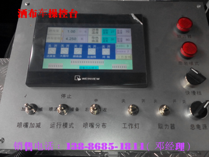 5该车的自动控制系统可以测量车速并根据输入的洒布量和喷洒宽度及沥青种类自动计算沥青泵转数从而再通过系统自动调整沥青泵的泵数。