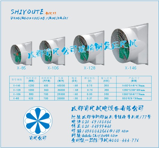 成都清风机电设备有限公司是专门从事工程安装、风机、通风设备设计、风管制作设计安装、制造的专业厂家,我厂生产主要产品有玻璃钢负压风机、镀锌负压风机、不锈钢风机、冷风机、湿濂、屋顶风机、厂房降温系统、厂房通风、降温风机、厂房排尘风机、油库通风、粮库通风、等系列一般用途和高温、防腐、防爆、耐磨等系列特殊用途风机,亦可根据用户需要设计制造所需参数及用途的风机。目前本厂生产的通风机产品在全国各地享有很高信誉及知名度,深受用户欢迎。