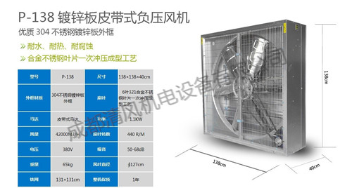 所有市售镀锌板方形负压风机结构、技术参数基本相同。主要型号有1380*1380*400mm(1.1KW)1220*1220*400mm(0.75 KW)、1100*1100*400mm(0.55 KW)、1000*1000*400mm(0.55KW) .900*900*400mm(0.37kw).800*800*400mm(0.37KW)等不同型号。所有镀锌版方形负压风机的转速均为450转/分钟,电机为4极1400转/分钟,电机防护等级IP44,B级绝缘。相对大型的负压风机抽风效率更高、更节能。 玻璃钢SMC模压负压风机从传动结构不同分为皮带式和直结式两种。皮带式转速在370-450转/分钟,采用六极或四极铝壳马达防护等级IP55 F级绝缘,转速低的产品噪音相对要低。直接式马达主要有12极440转/分钟、10极560转/分钟、8极720转/分钟三种,12极马达使用最多,转速高的风机噪音大。皮带式产品最省电节能、经济耐用,直结式产品适合在皮带式不能工作的如有油污、对皮带有腐蚀的场所使用。