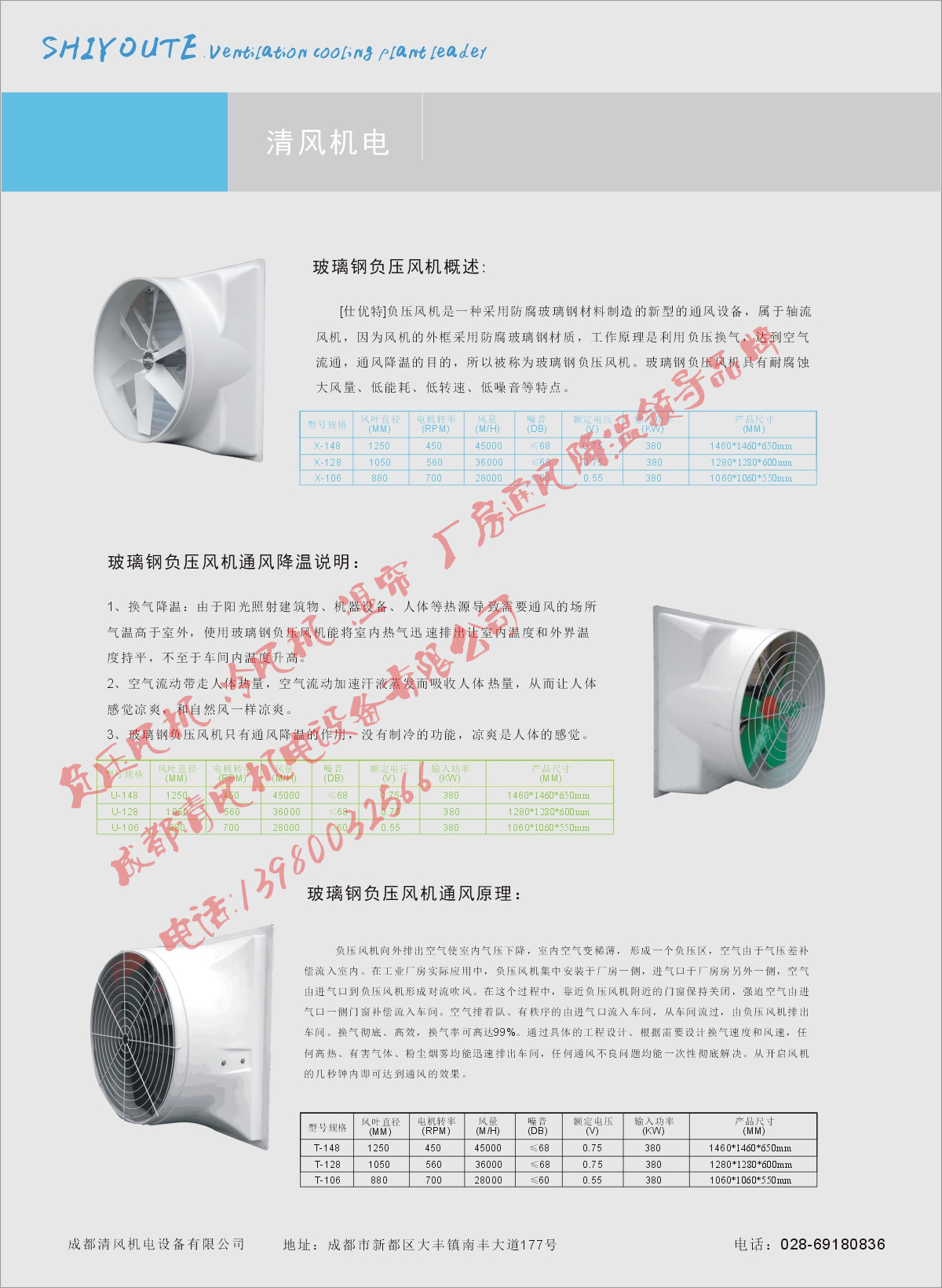 成都清风机电设备有限公司是专门从事工程安装、风机、通风设备设计、风管制作设计安装、制造的专业厂家,我厂生产主要产品有玻璃钢负压风机、镀锌负压风机、不锈钢风机、冷风机、湿濂、屋顶风机、厂房降温系统、厂房通风、降温风机、厂房排尘风机、油库通风、粮库通风、等系列一般用途和高温、防腐、防爆、耐磨等系列特殊用途风机,亦可根据用户需要设计制造所需参数及用途的风机。目前本厂生产的通风机产品在全国各地享有很高信誉及知名度,深受用户欢迎。